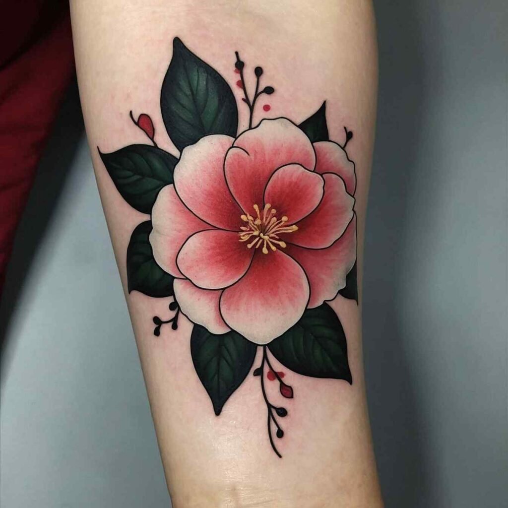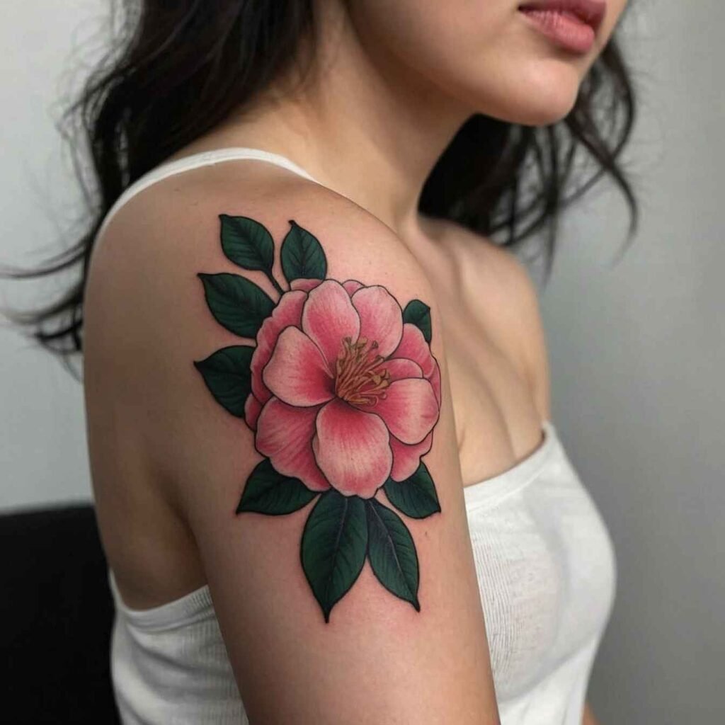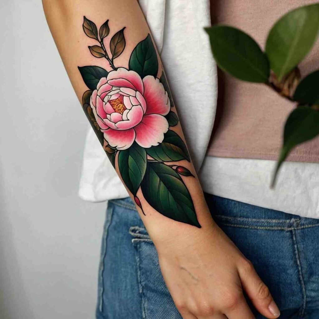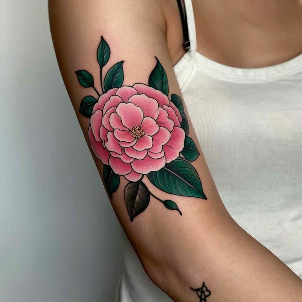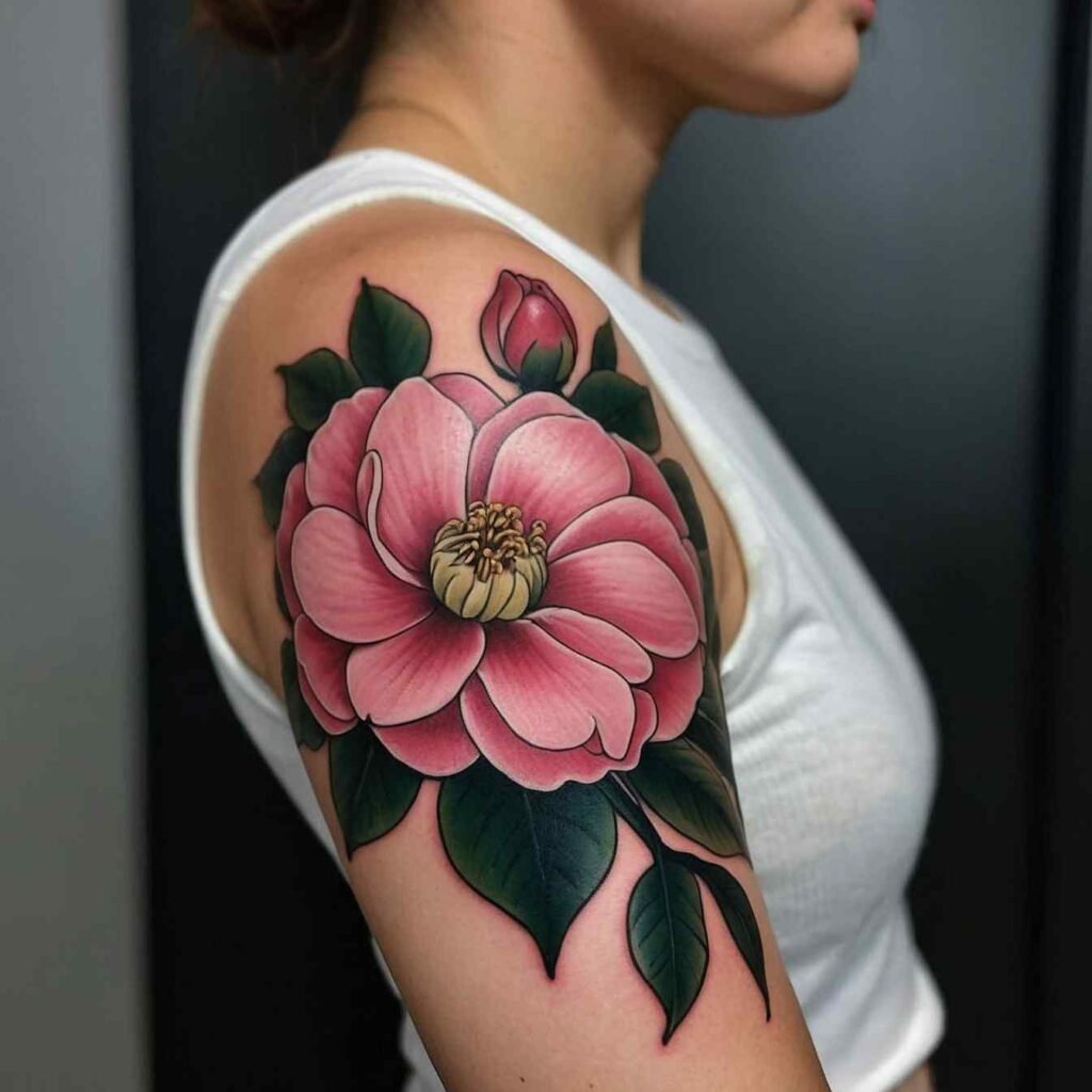 Camellias are symbols of love, affection, and admiration. A camellia sleeve tattoo can represent a deep bond with a loved one or a passion for beauty. The soft, rounded petals create a romantic and graceful design.