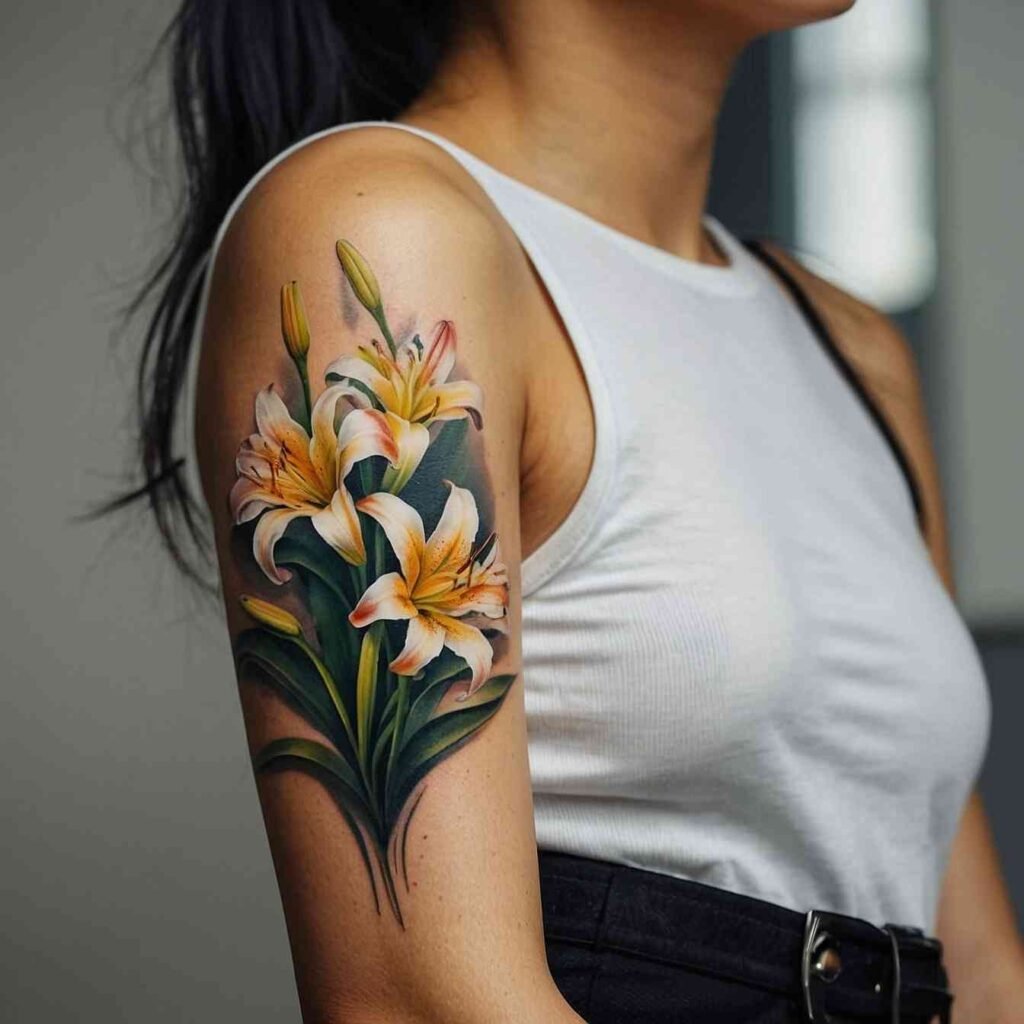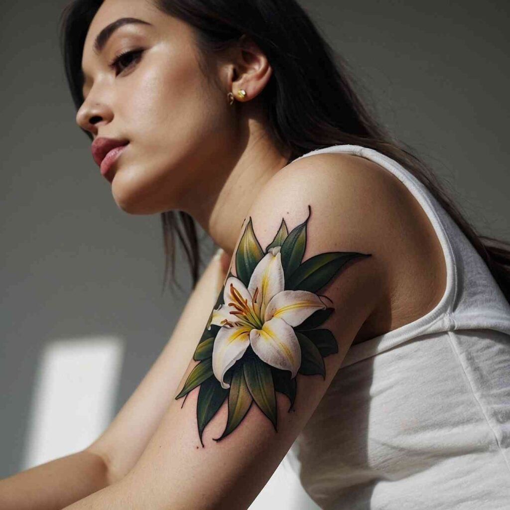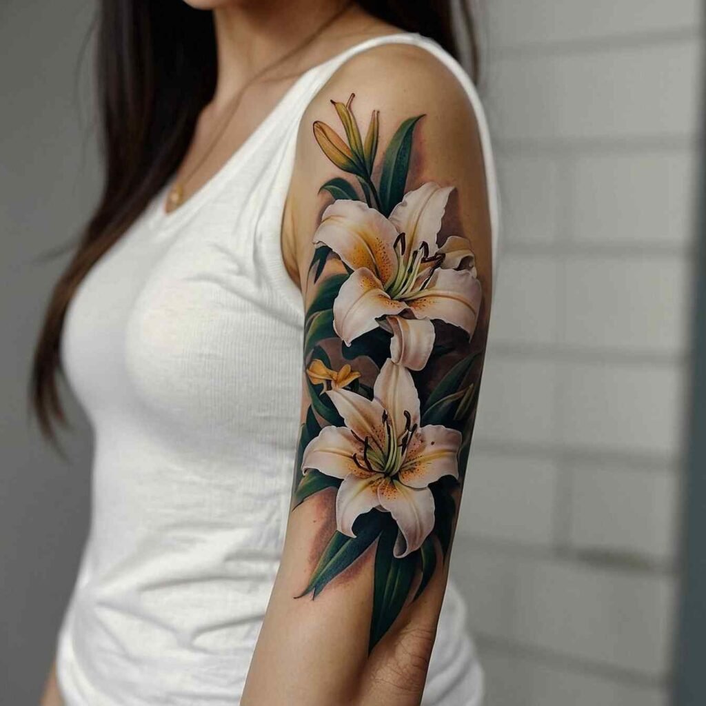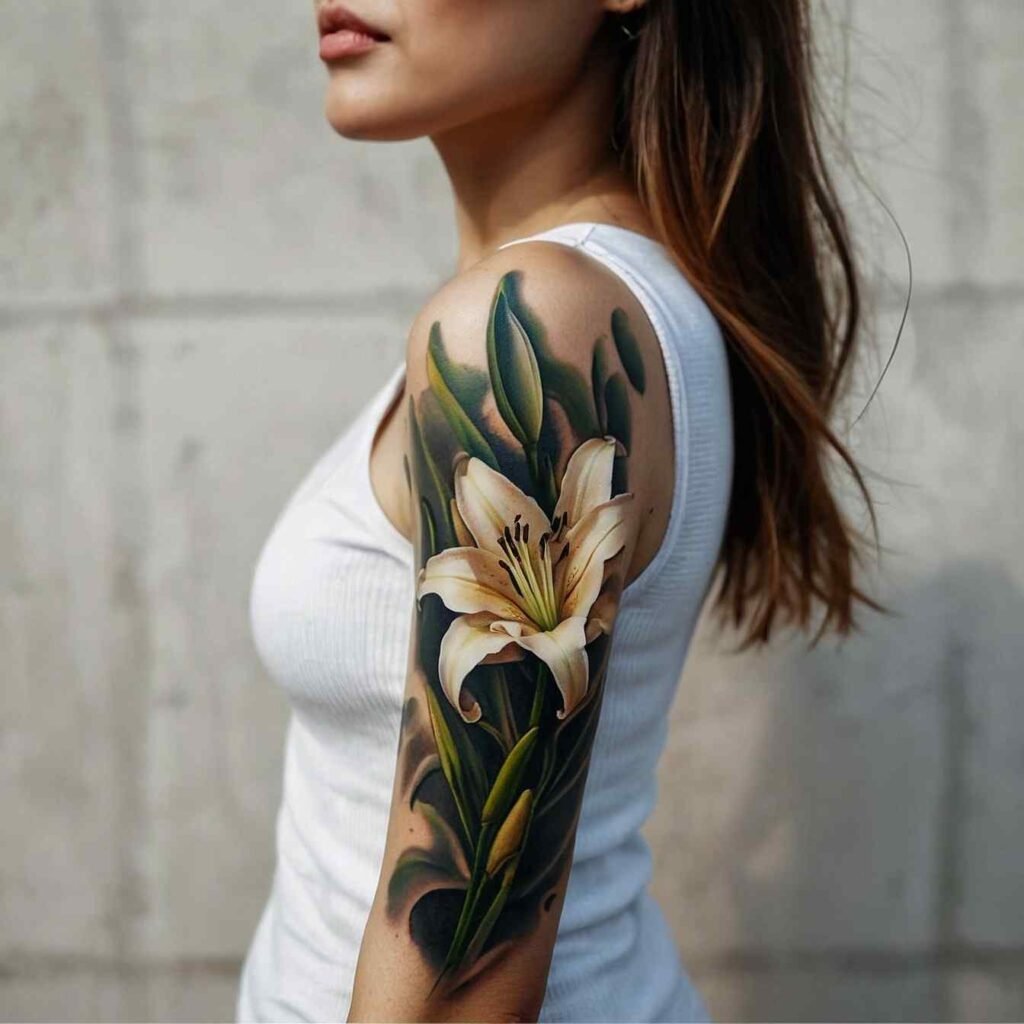 Lilies are associated with purity, renewal, and transition. A lily sleeve tattoo can represent personal growth and the ability to overcome challenges. The graceful petals of the lily add elegance to any sleeve design.