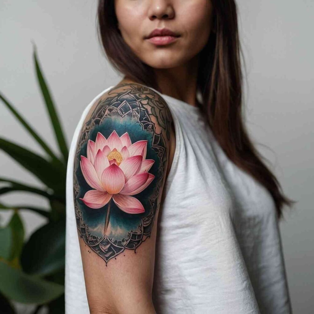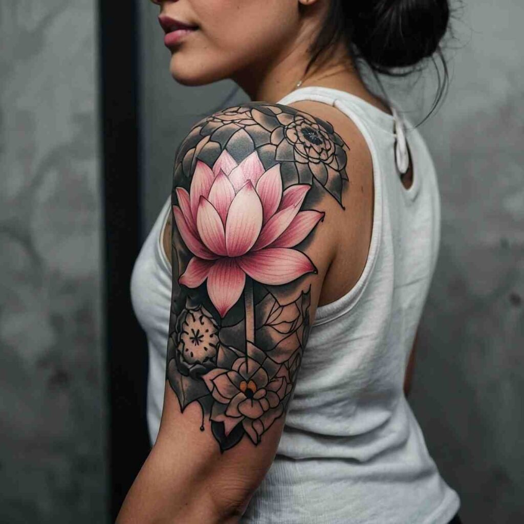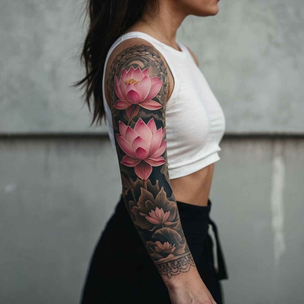Lotus flowers symbolize purity, enlightenment, and rebirth. This flower is often associated with spiritual growth and personal transformation. A lotus sleeve tattoo can be a reminder of inner strength and the journey of rising above challenges.