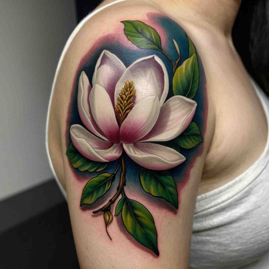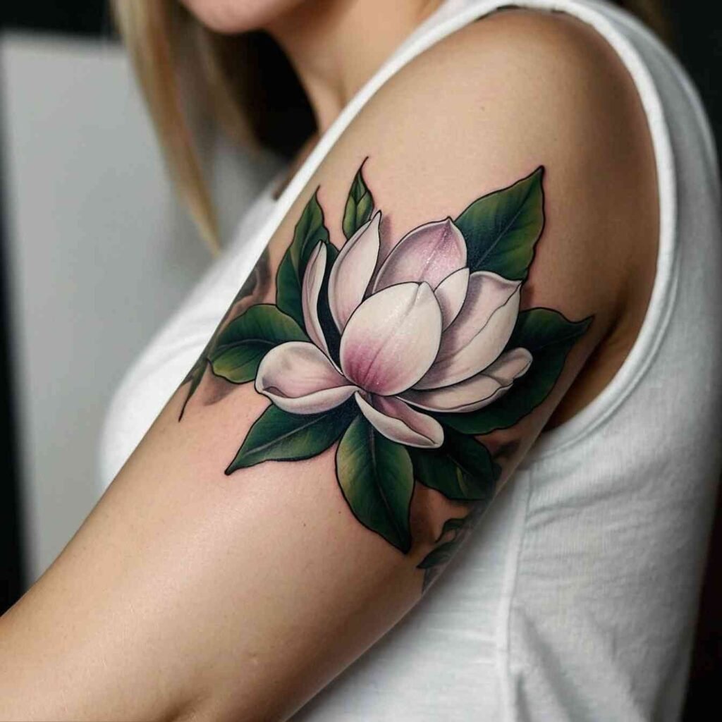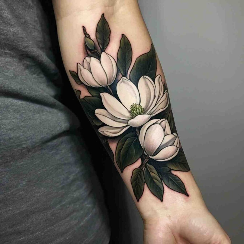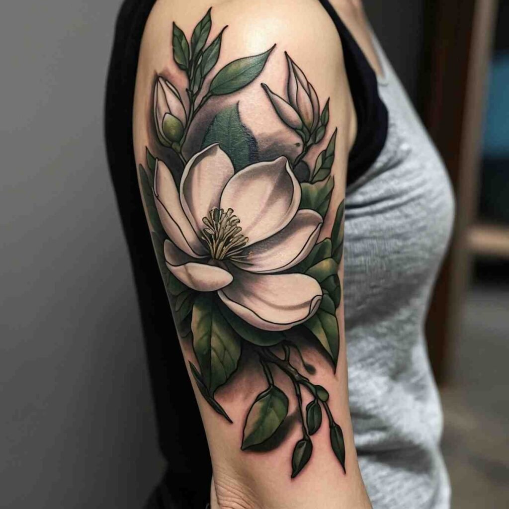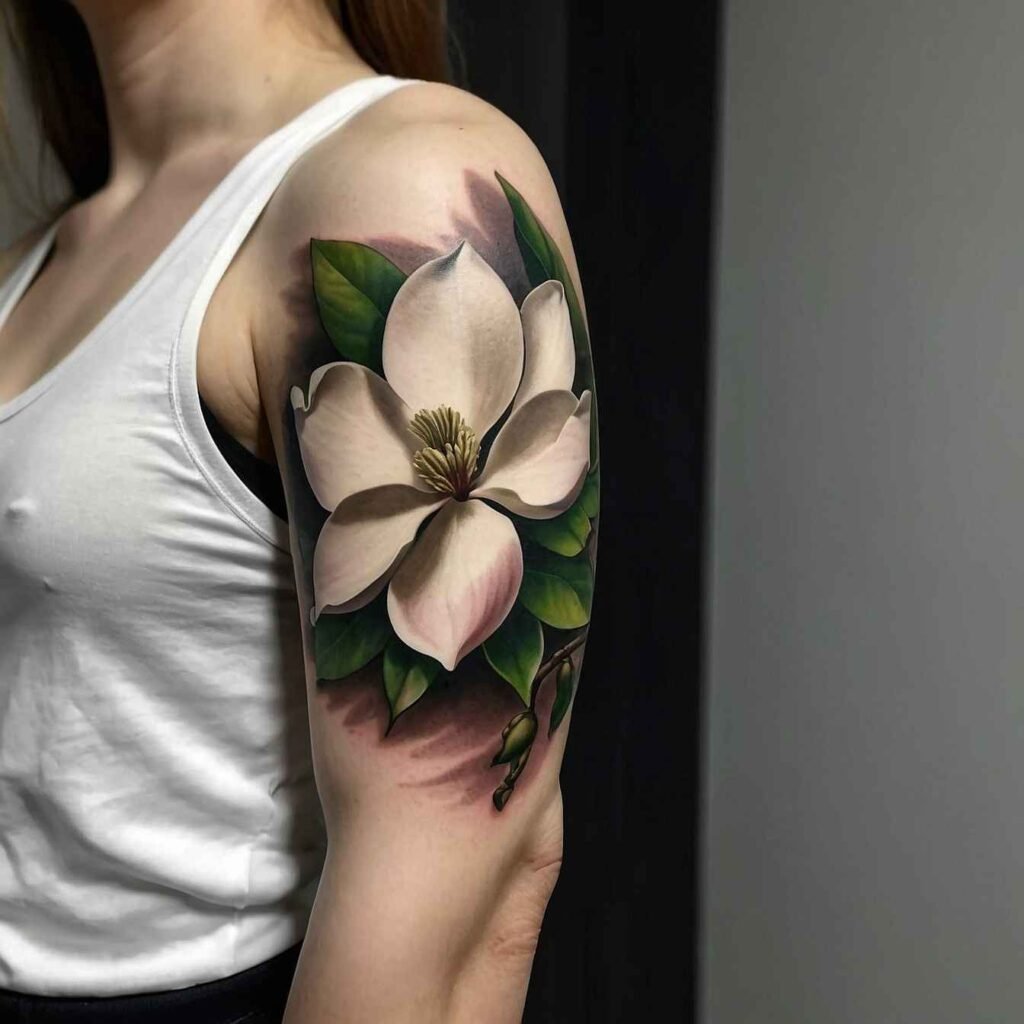Magnolias represent dignity, strength, and a love for nature. A magnolia sleeve tattoo can symbolize the beauty of nature and the power of enduring through life’s challenges. The large, showy blossoms make a bold statement.