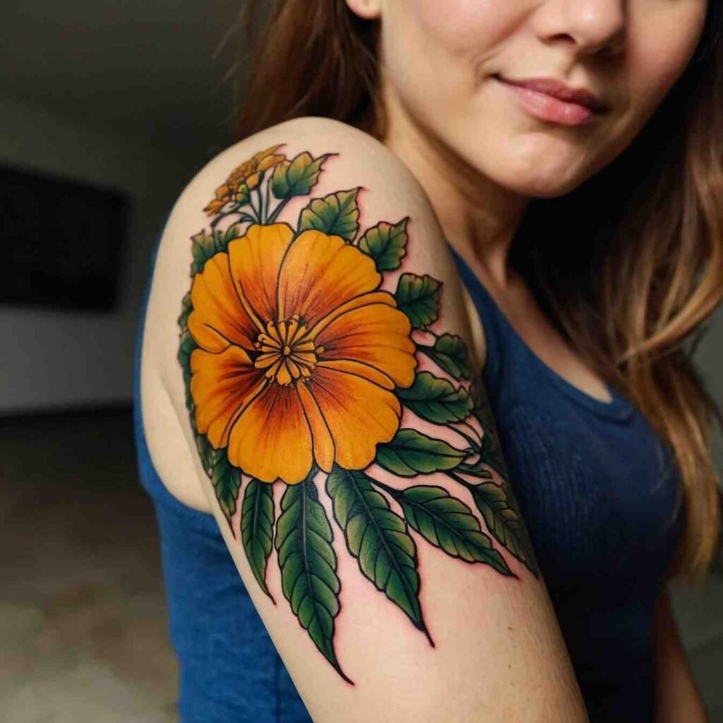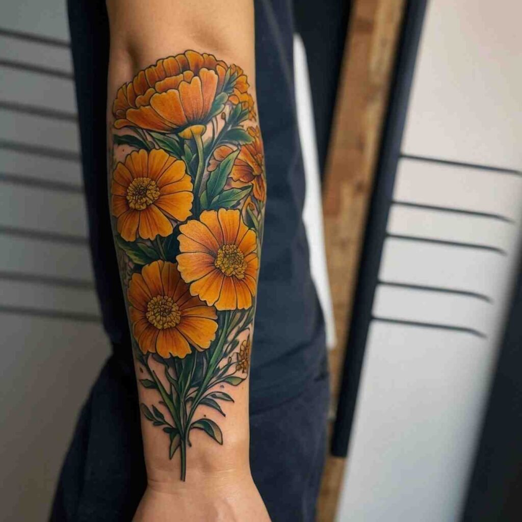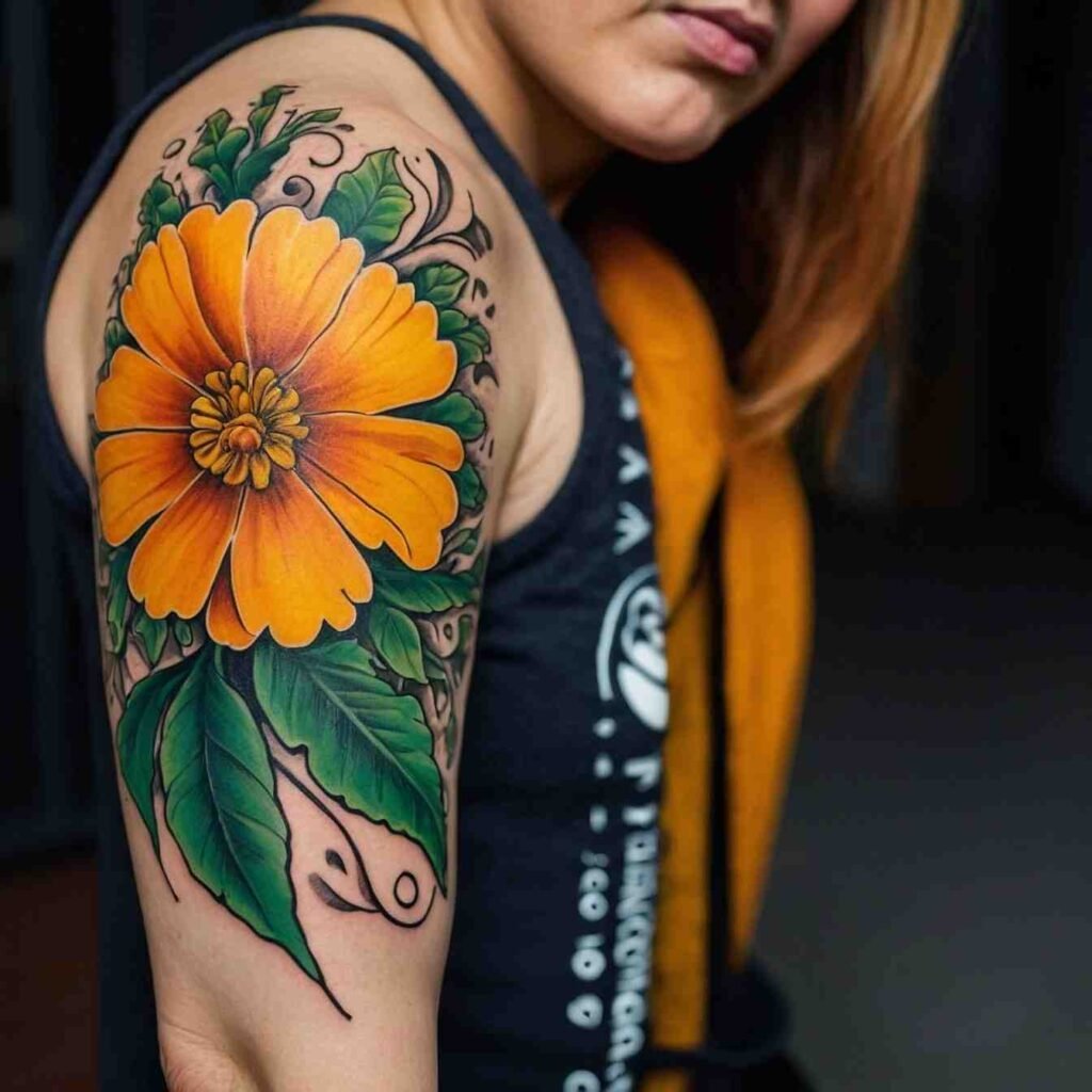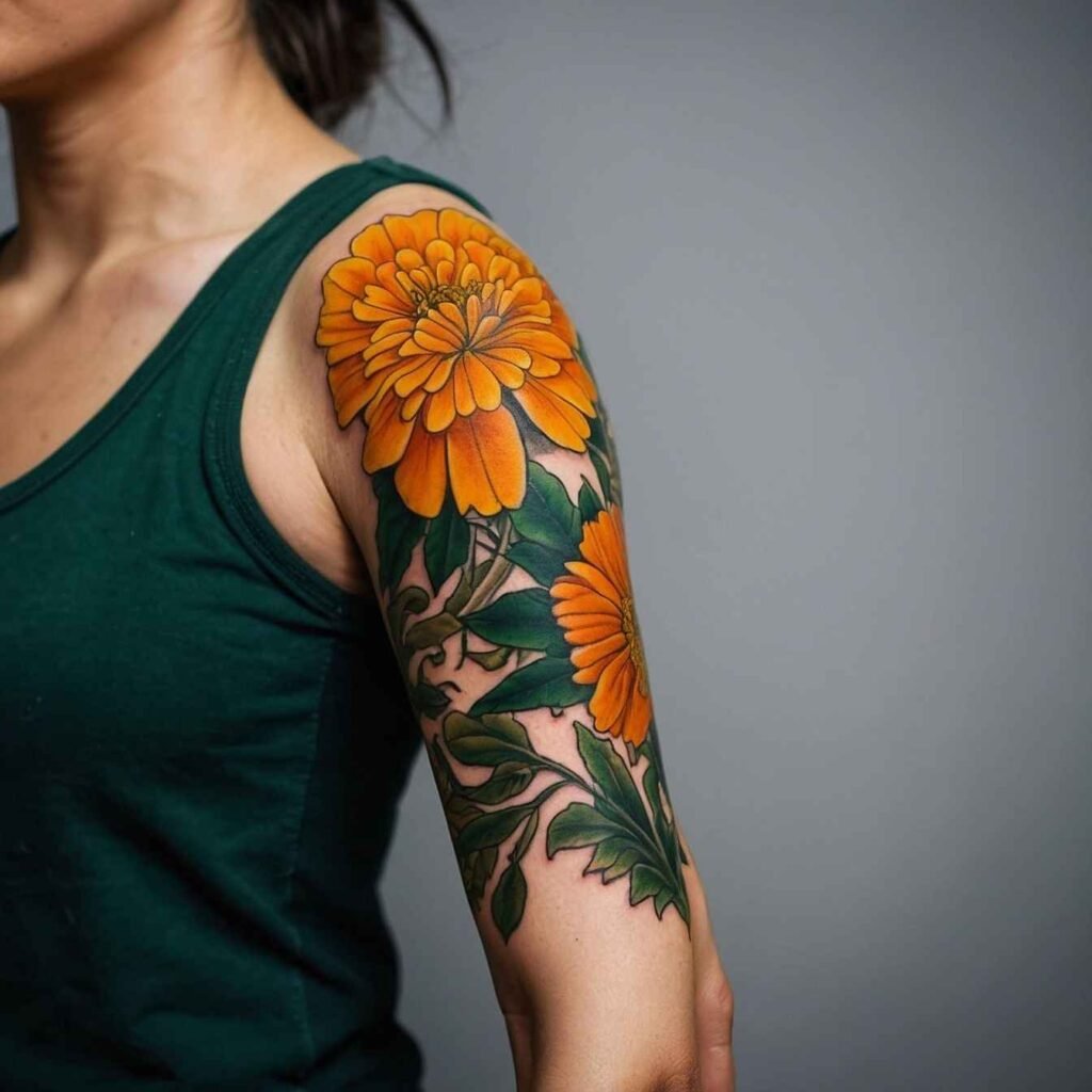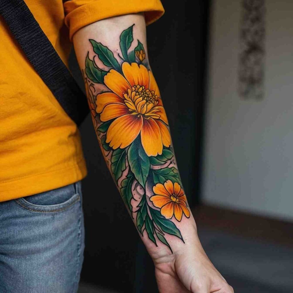Marigolds symbolize passion, creativity, and the celebration of life. A marigold sleeve tattoo is perfect for those who embrace life with enthusiasm and joy. The vibrant orange and yellow hues of the marigold add a burst of color to the design.