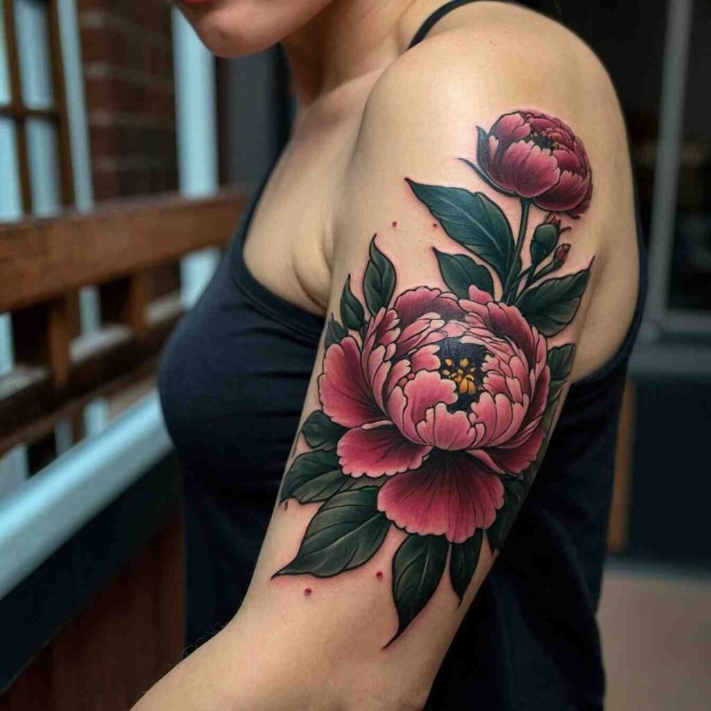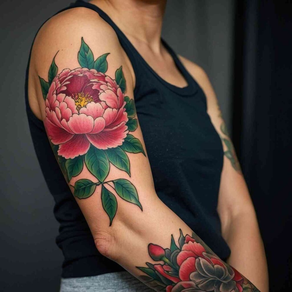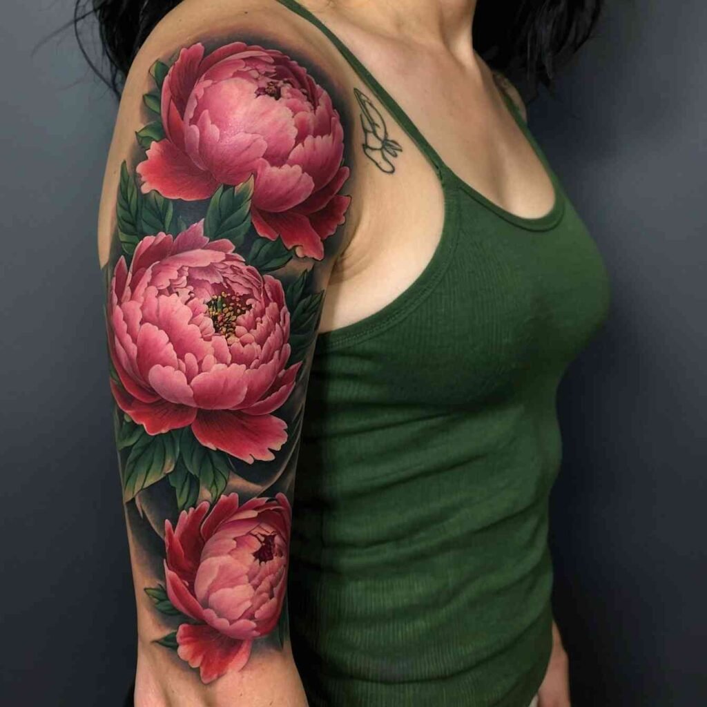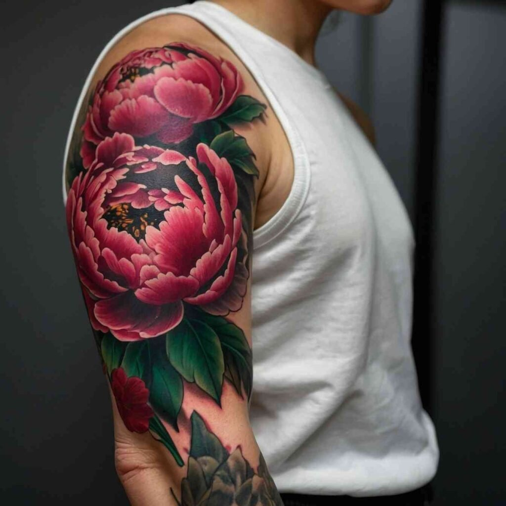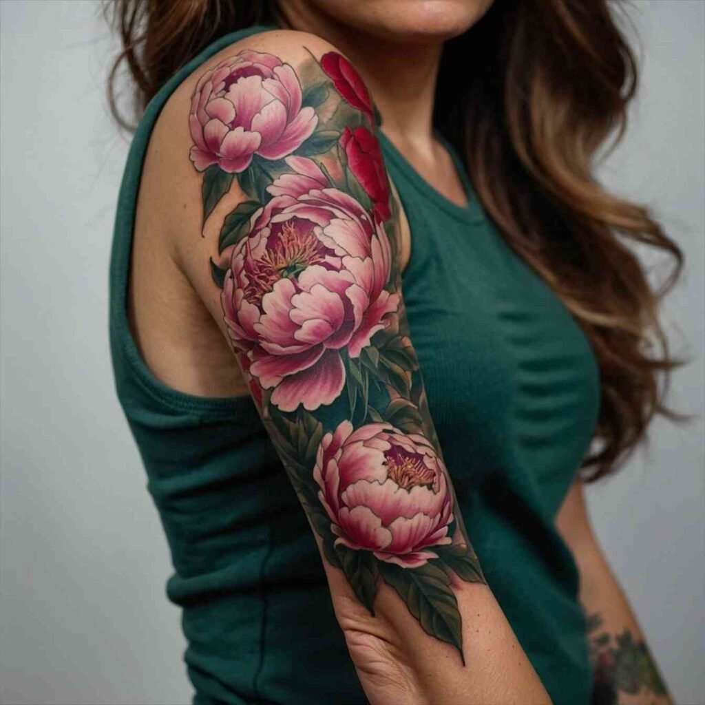 Peonies are often associated with prosperity, honor, and romance. Their lush, full blooms make for a striking sleeve tattoo design. A peony sleeve can represent a life filled with love, happiness, and success.