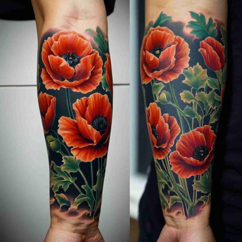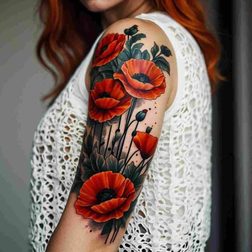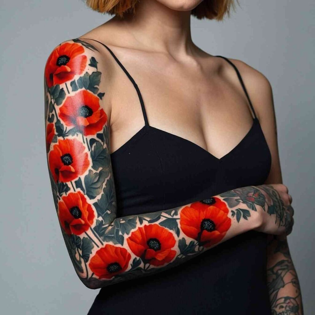 Poppies symbolize remembrance, peace, and eternal sleep. A poppy sleeve tattoo can be a meaningful tribute to a loved one or a symbol of peace in your life. The bold red color of poppies makes them stand out beautifully on the skin.