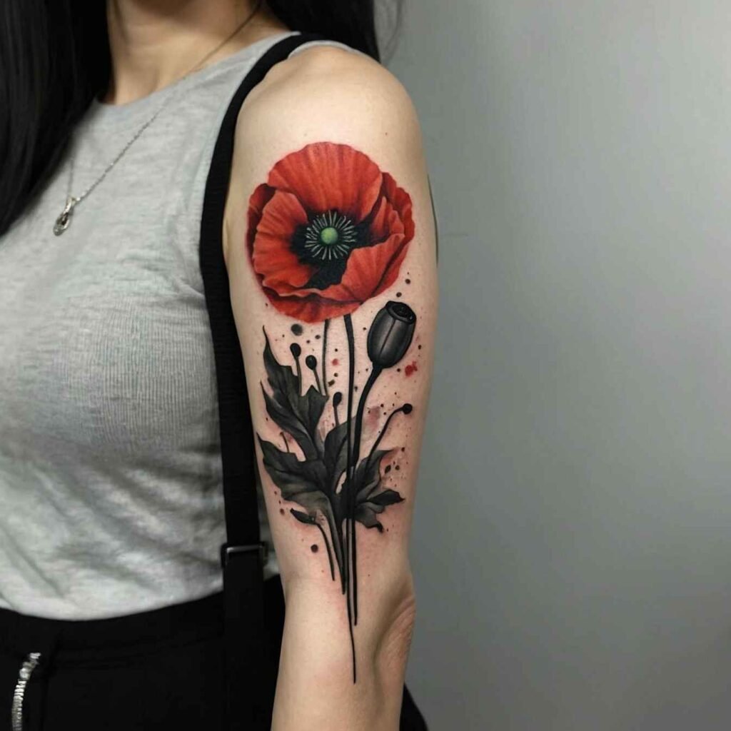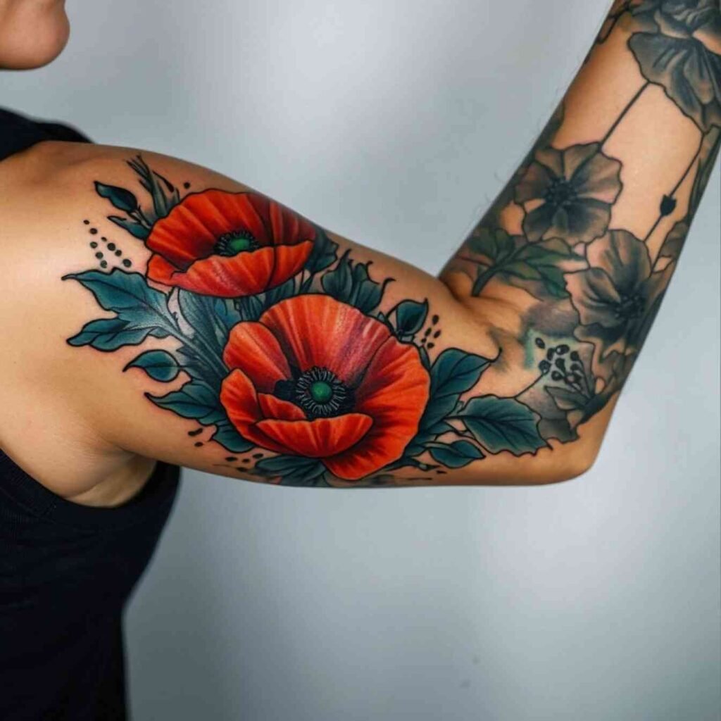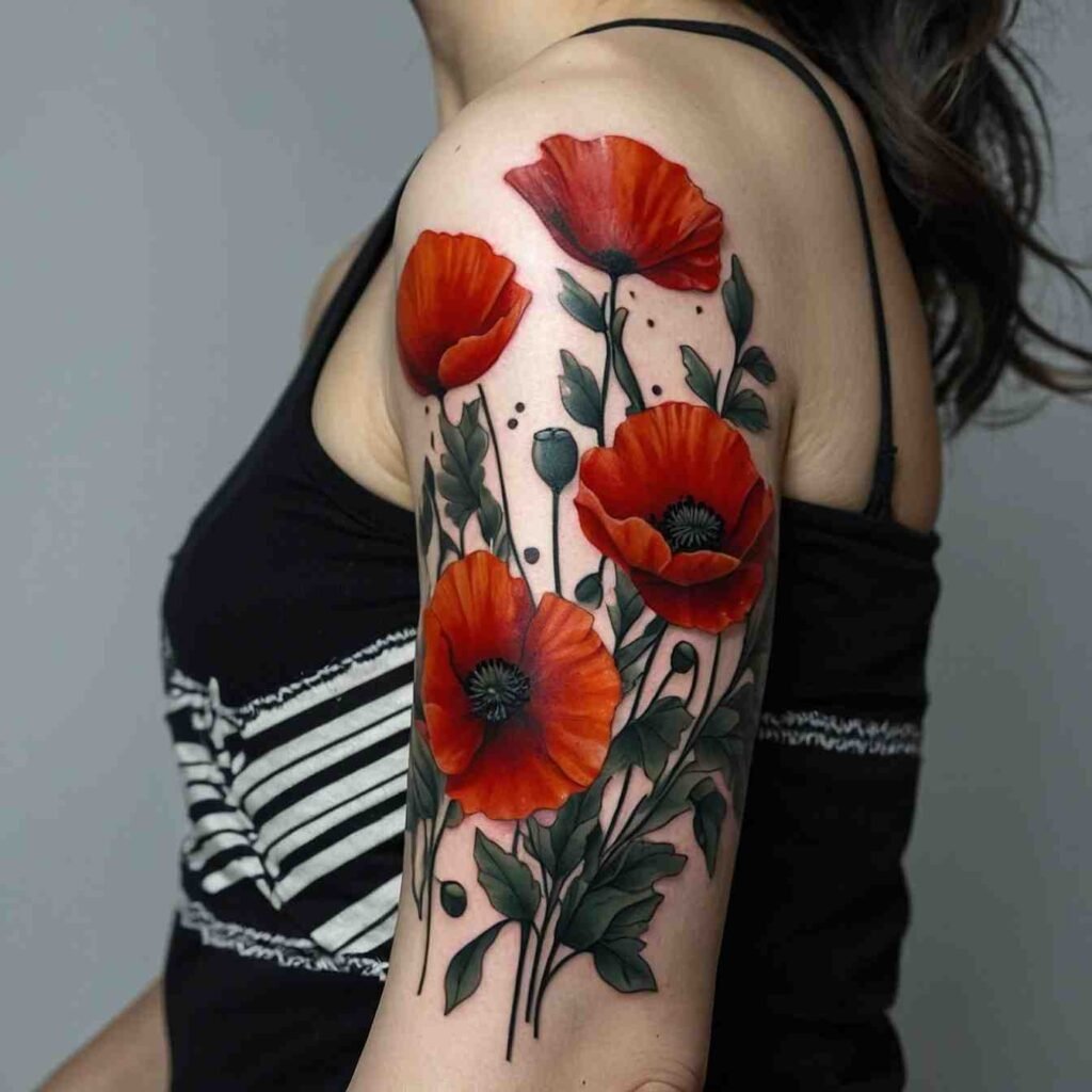 Poppies symbolize remembrance, peace, and eternal sleep. A poppy sleeve tattoo can be a meaningful tribute to a loved one or a symbol of peace in your life. The bold red color of poppies makes them stand out beautifully on the skin.