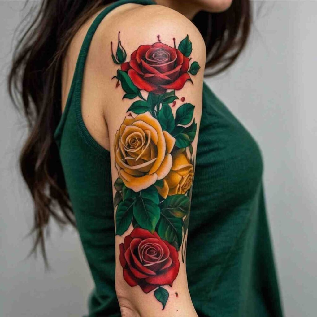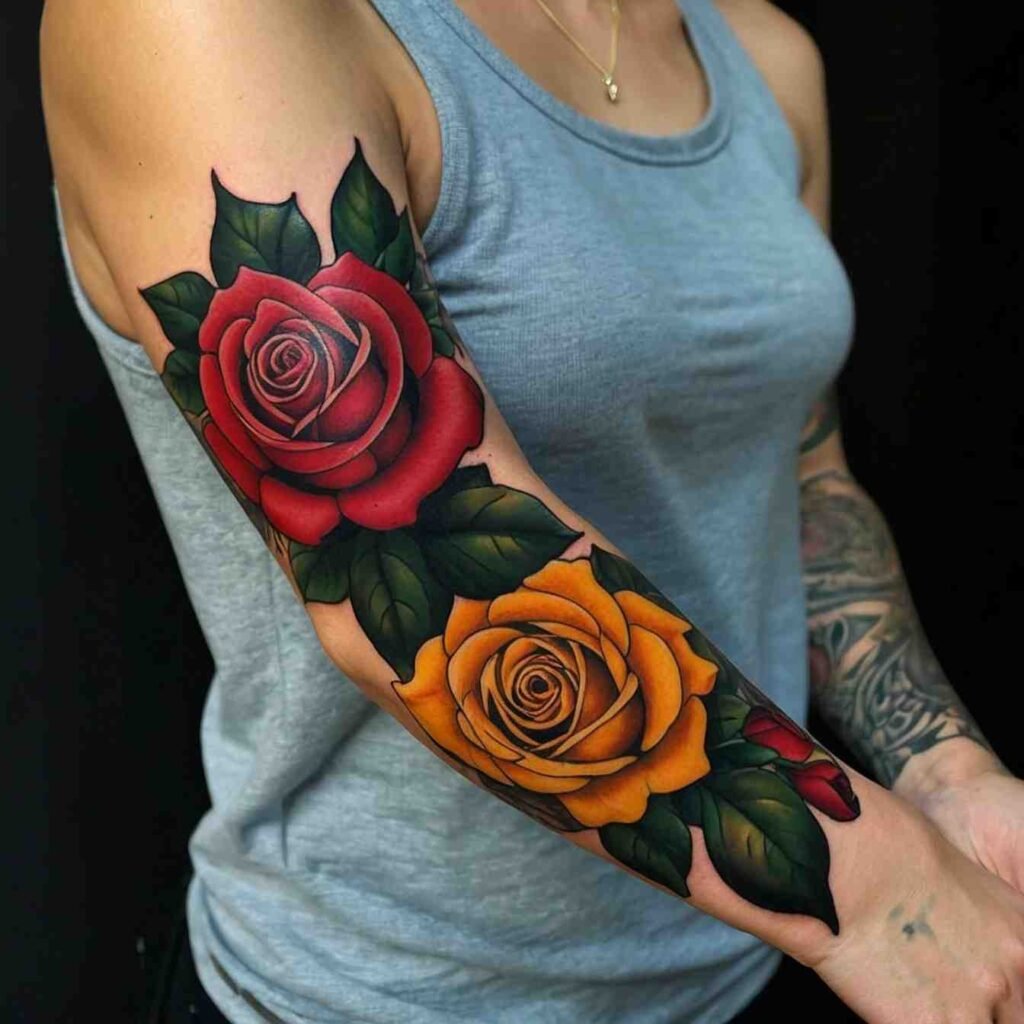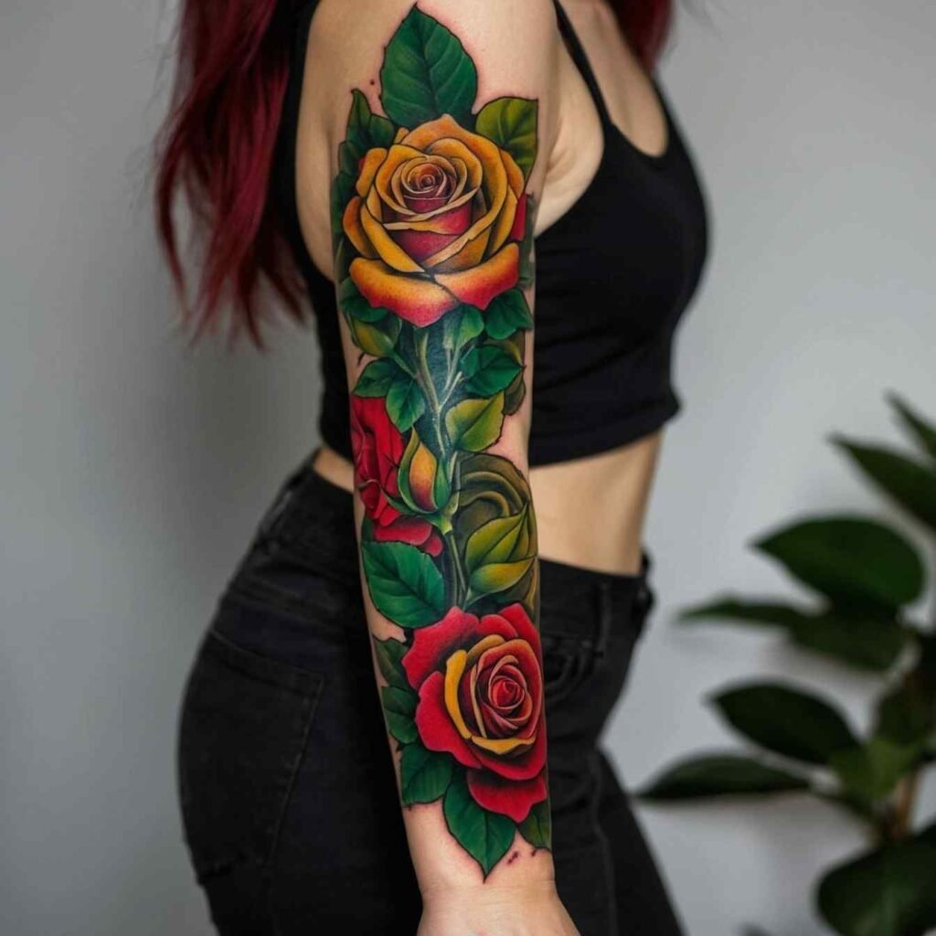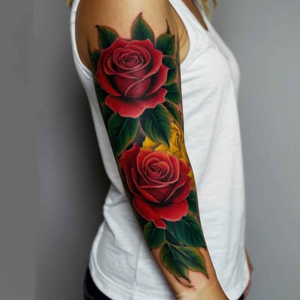 A rose sleeve tattoo symbolizes love, passion, and beauty. Roses come in various colors, each with its own meaning. For instance, red roses represent deep love, while yellow roses stand for friendship and joy. This classic flower is perfect for a sleeve tattoo, offering endless design possibilities with its rich symbolism.