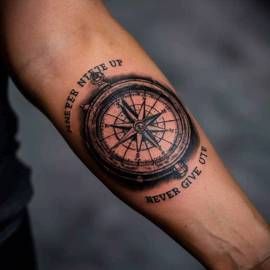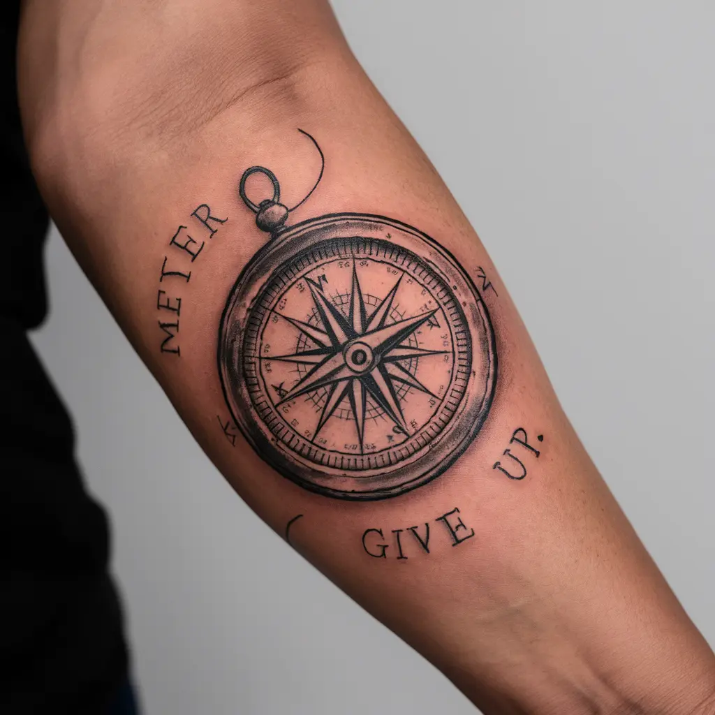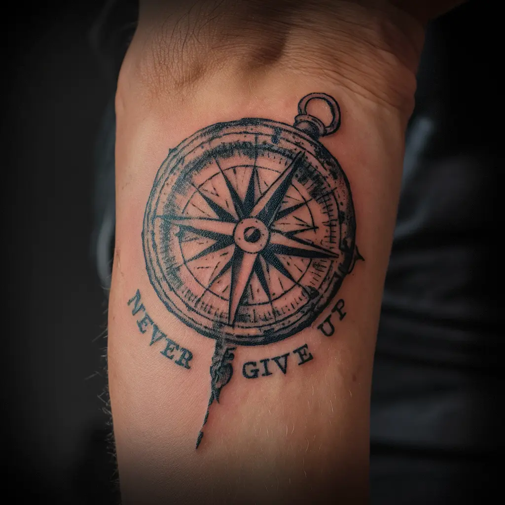 Meaning: A compass symbolizes direction, and with “never give up” inscribed along its edge, it’s a constant reminder to keep going no matter how lost or uncertain you feel.